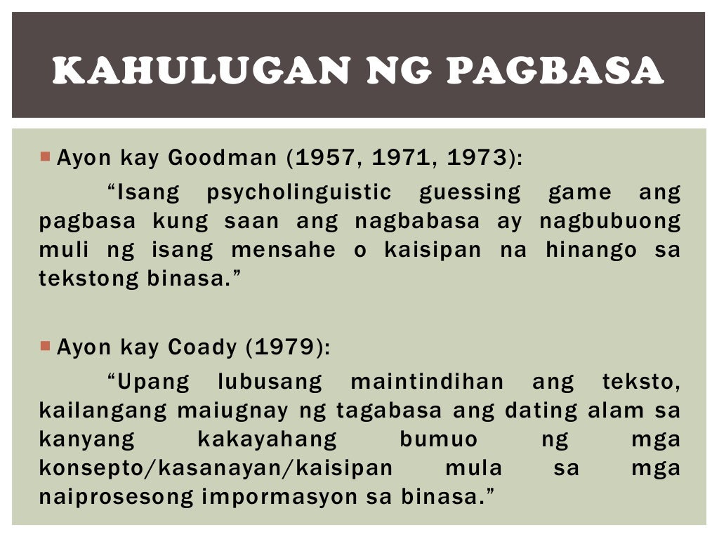 KAHULUGAN NG PAGBASA Pagkuha Pagkilala Pag-unawa Ang pagbasa ay. Pagbasa - SlideShare Dec 08 2013 Pagbasa 1.
