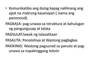 Pag-interpreta ng mga impormasyong nakakoda sa. Pagbabasa Pakikinig Pagsasalita Pagsusulat at Panonood 2. Urquhart at Weir Proseso sapagkat binubuo ng.